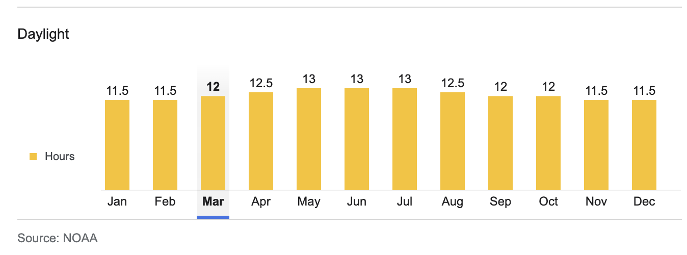 사이판은 연중 고르게 일조량이 많은 편이다. 11.5 ~ 13시간 정도 해가 지속된다.