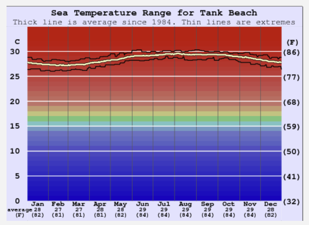 사이판의 평균 바다 수온은 연중 27도 ~ 29도로 매우 따뜻하다. 2월과 3월이 27도로 가장 온도가 낮고, 6월 ~ 11월까지가 29도로 가장 수온이 따뜻하다. 연중 내내 해양 스포츠를 즐기기 좋은 온도이다.